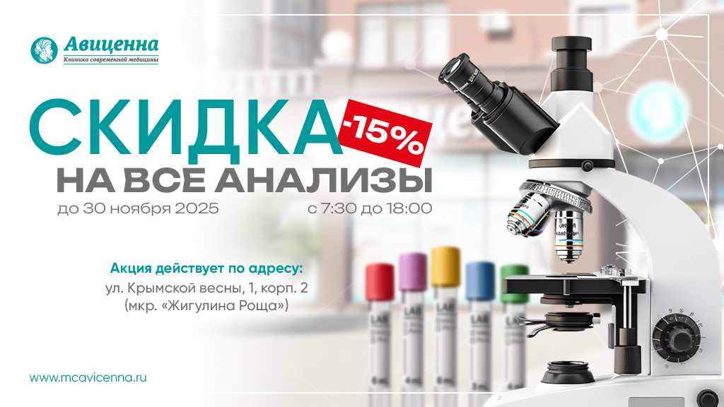 С 1 ноября по 30 ноября в клинике «Авиценна» действует специальное предложение: скидка 15% на все лабораторные анализы!